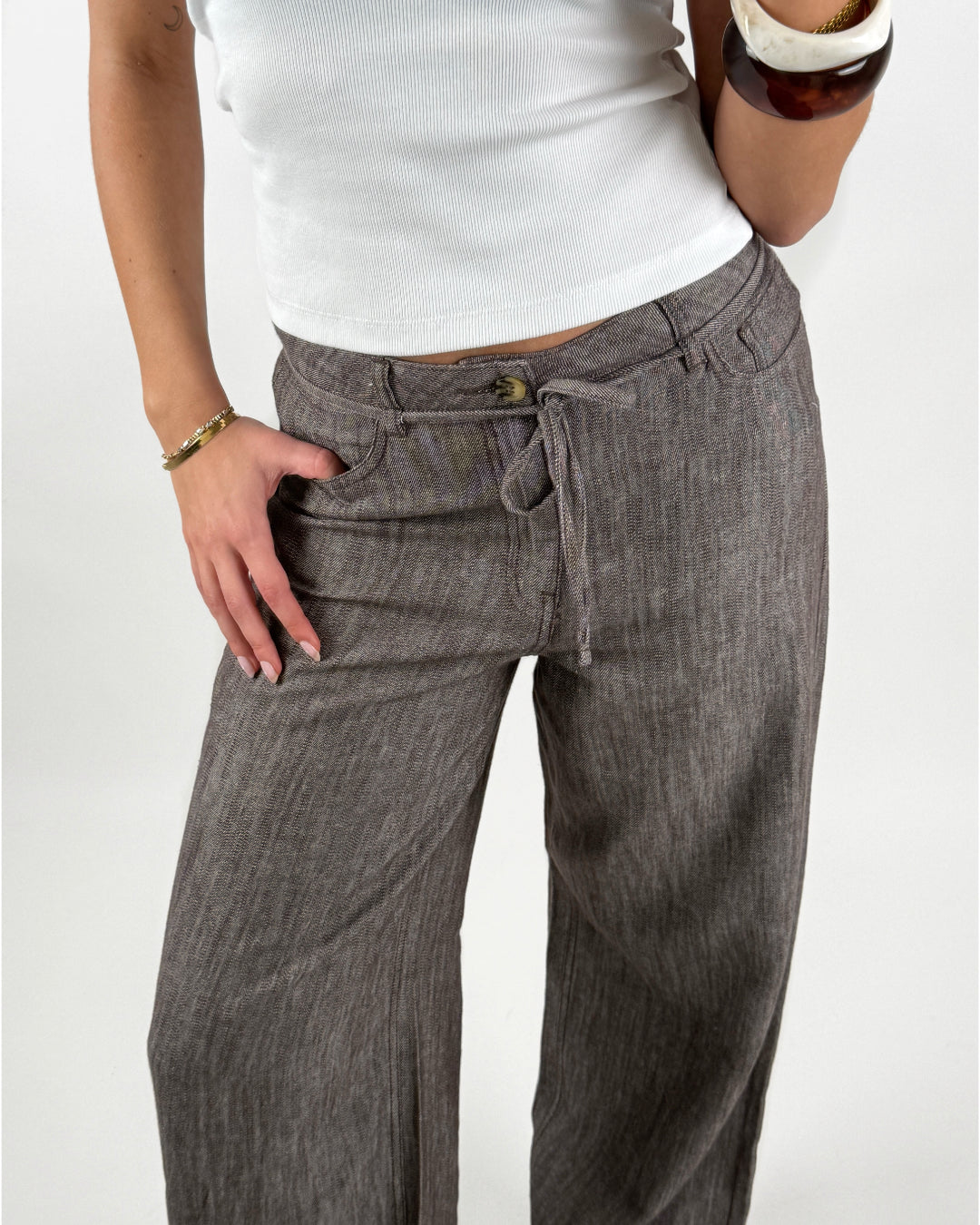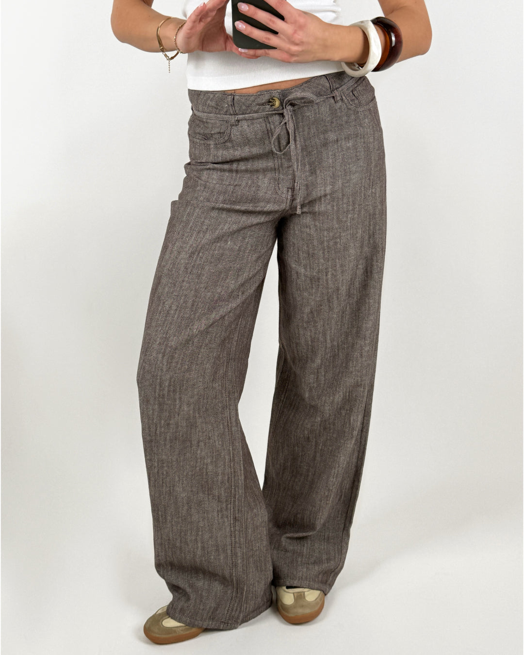 Modellen har en dejlig, løs pasform med vide ben og snøre i taljen, som giver et afslappet og moderne look. Bukserne har klassisk lomme design samt knap- og lynlåslukning, hvilket gør dem nemme at style til både skjorter, t-shirts eller lette striktrøjer.