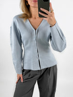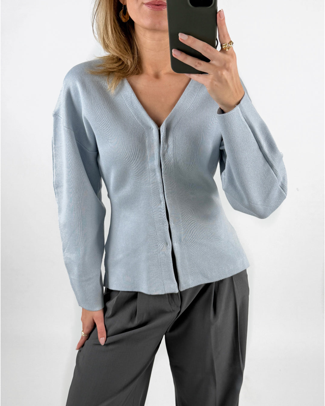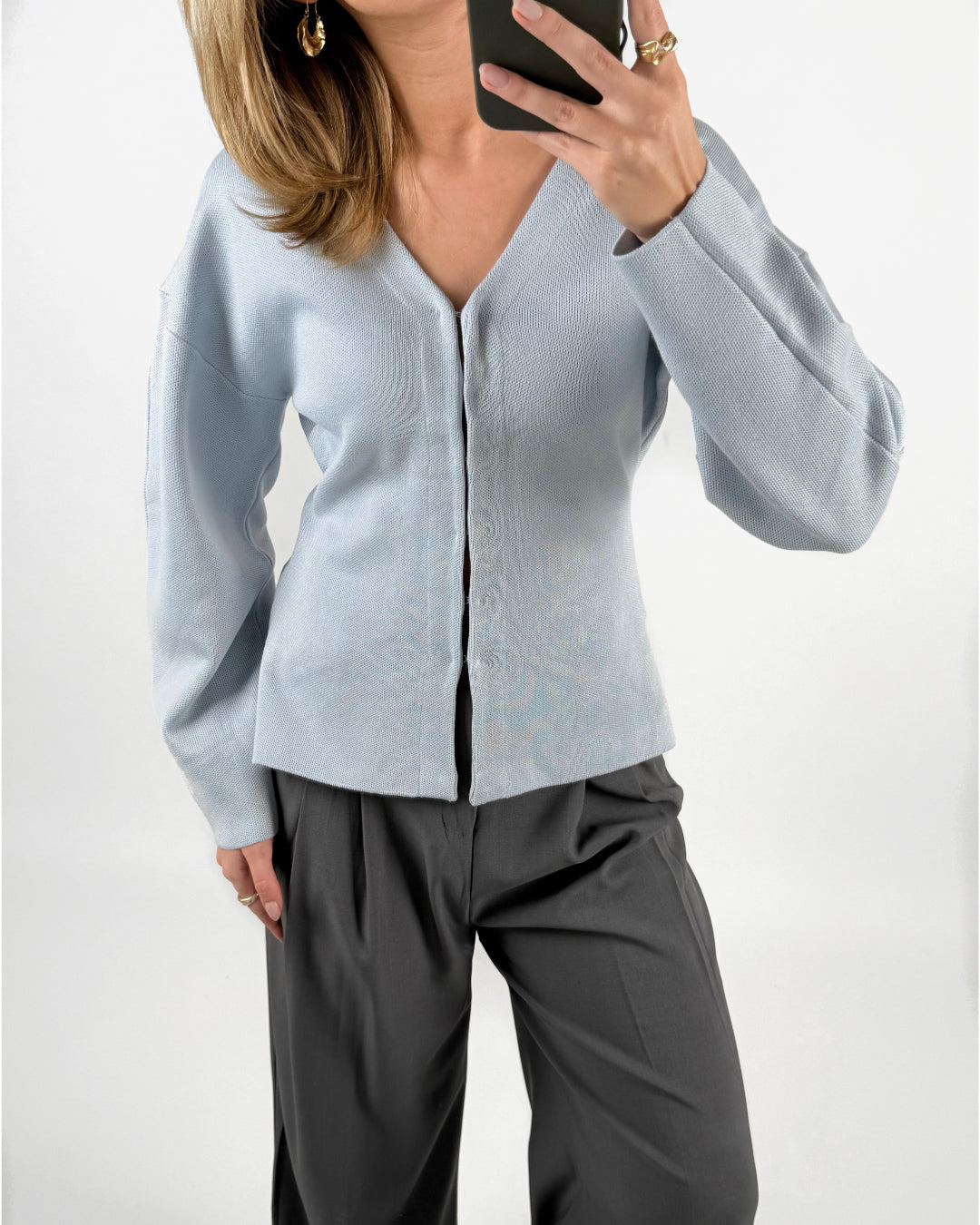 INDY cardigan, lyseblå er en virkelig fin og enkelt cardigan med skjult lukning foran. Den er meget simpel og elegant. Den er faconsyet og kan bruges som en blazer.