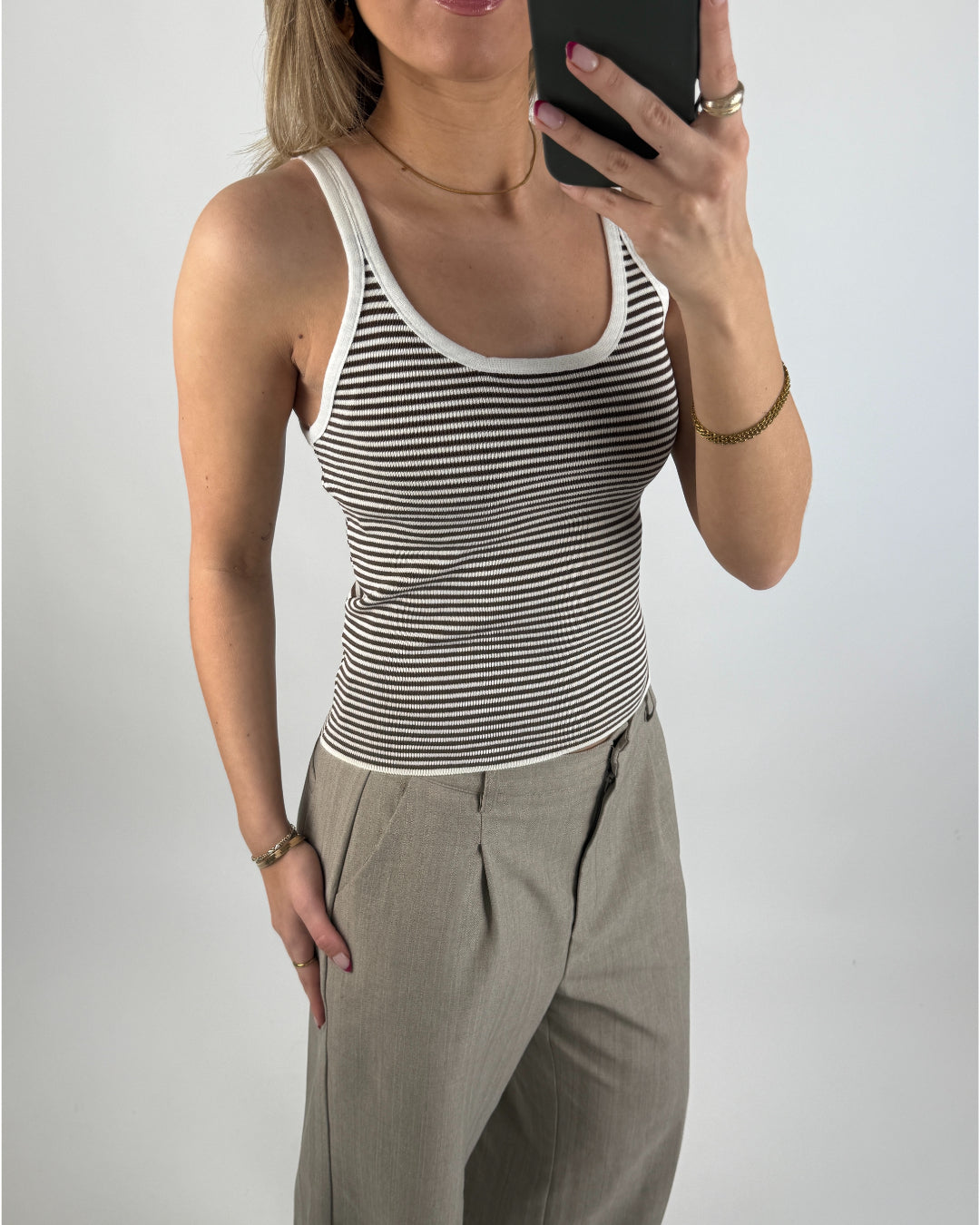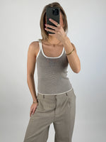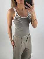 Toppen findes i to tidløse varianter: sort med hvide striber og sorte kanter samt brun med hvide striber og hvide kanter. Det enkle design og de fine striber gør den let at style både alene eller som lag under en skjorte eller cardigan. En skøn must-have til sommerens basisgarderobe og perfekte, afslappede outfits.
