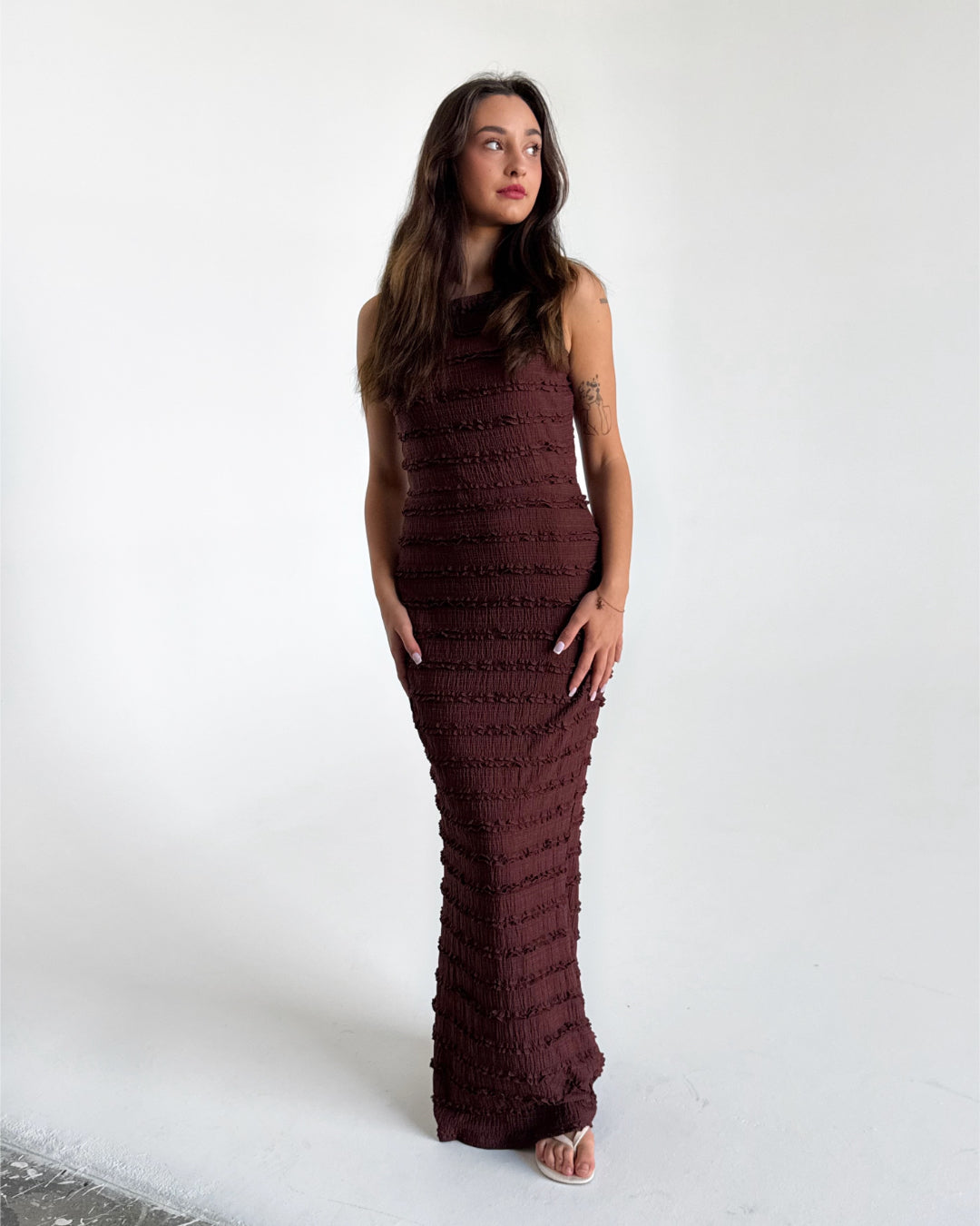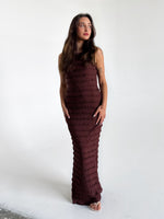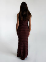 Vores KIMBERLY kjole, brun er en smuk maxi kjole, i et utrolig feminint look.
