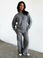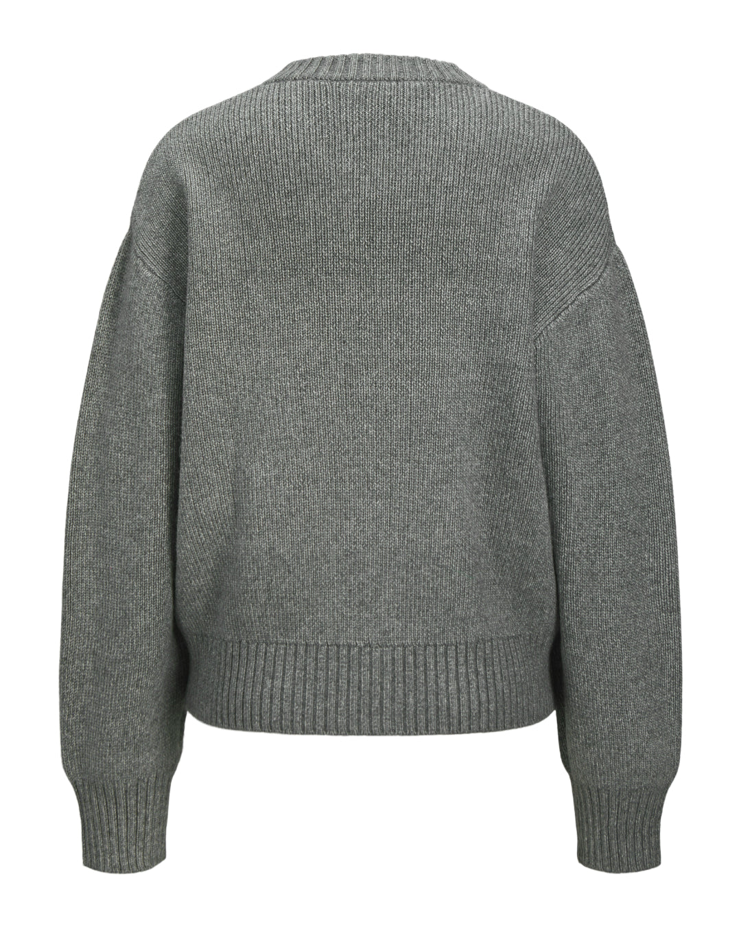 MAEVE bomber cardigan, grå er i et tæt strikket materiale, hvilket gør at den føles kraftig og varm til de køligere måneder.
