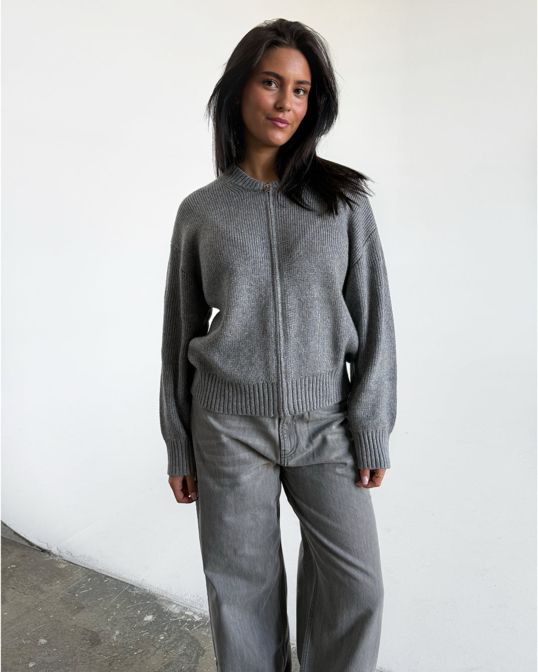 Den smarte MAEVE bomber cardigan, grå sidder godt på kroppen og er i det blødeste materiale!! Trøjen har lange ærmer, lukkes med lynlås og går helt op i halsen.