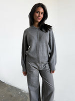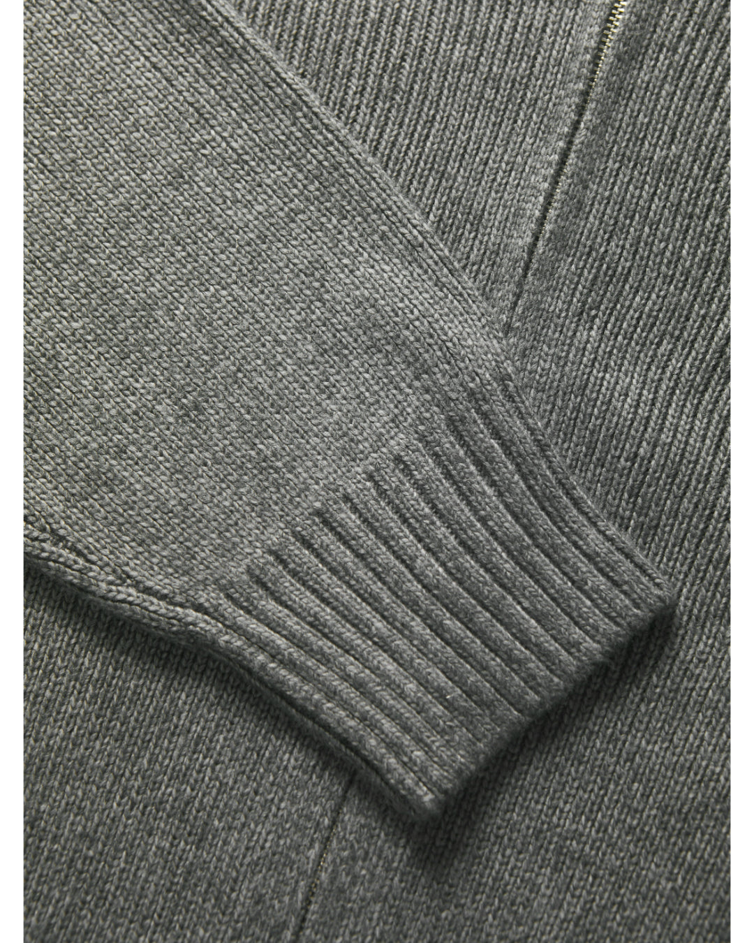 Detaljefoto af grå Maeve strikcardigan med lynlås. Fra BySofieSønderby