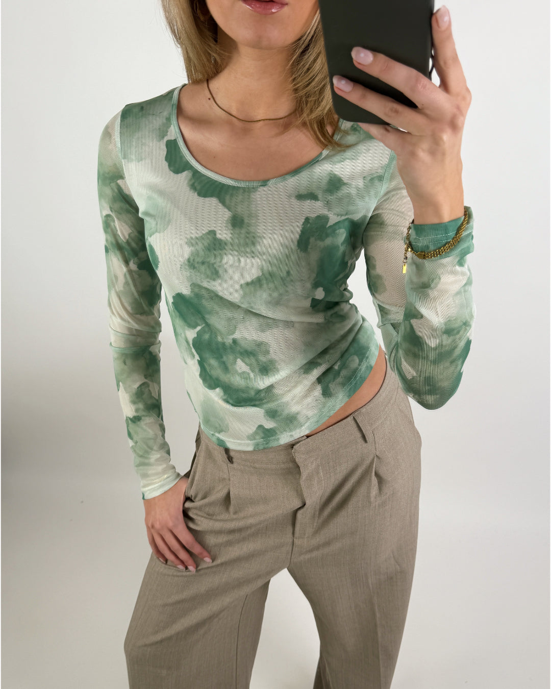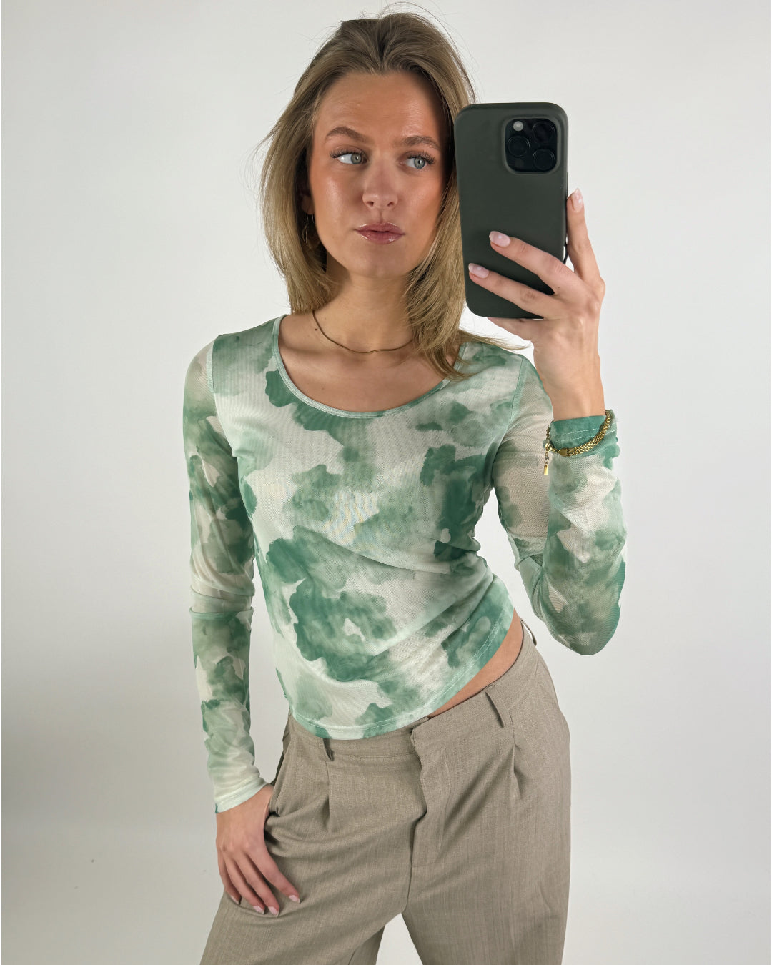 Se denne MALLE mesh bluse, grøn i grønne og hvide nuancer. Blusen har et let, transparent materiale med et unikt, skyinspireret mønster, der giver et moderne og elegant udtryk.