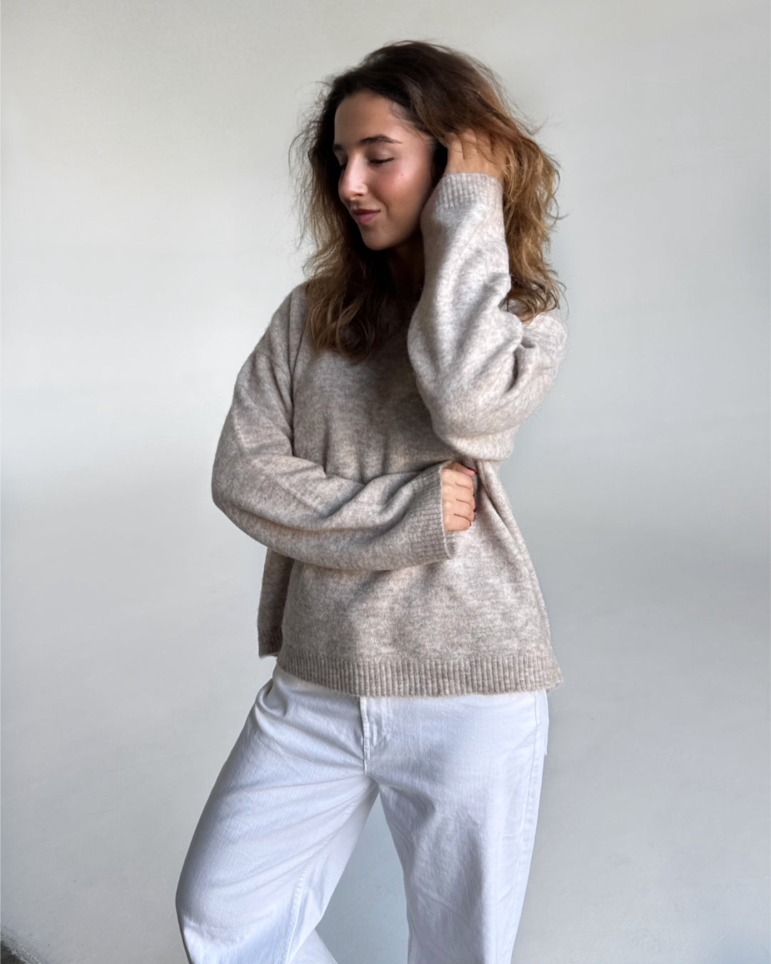 MATILDA strik, beige er det nyeste bud på en lækker, enkelt, baggy og virkelig blød strik i webshoppen. Strikken er en garderobeklassiker, og vil være perfekt til de kølige dage.