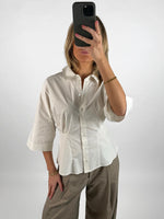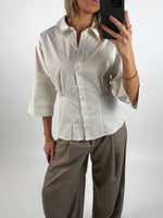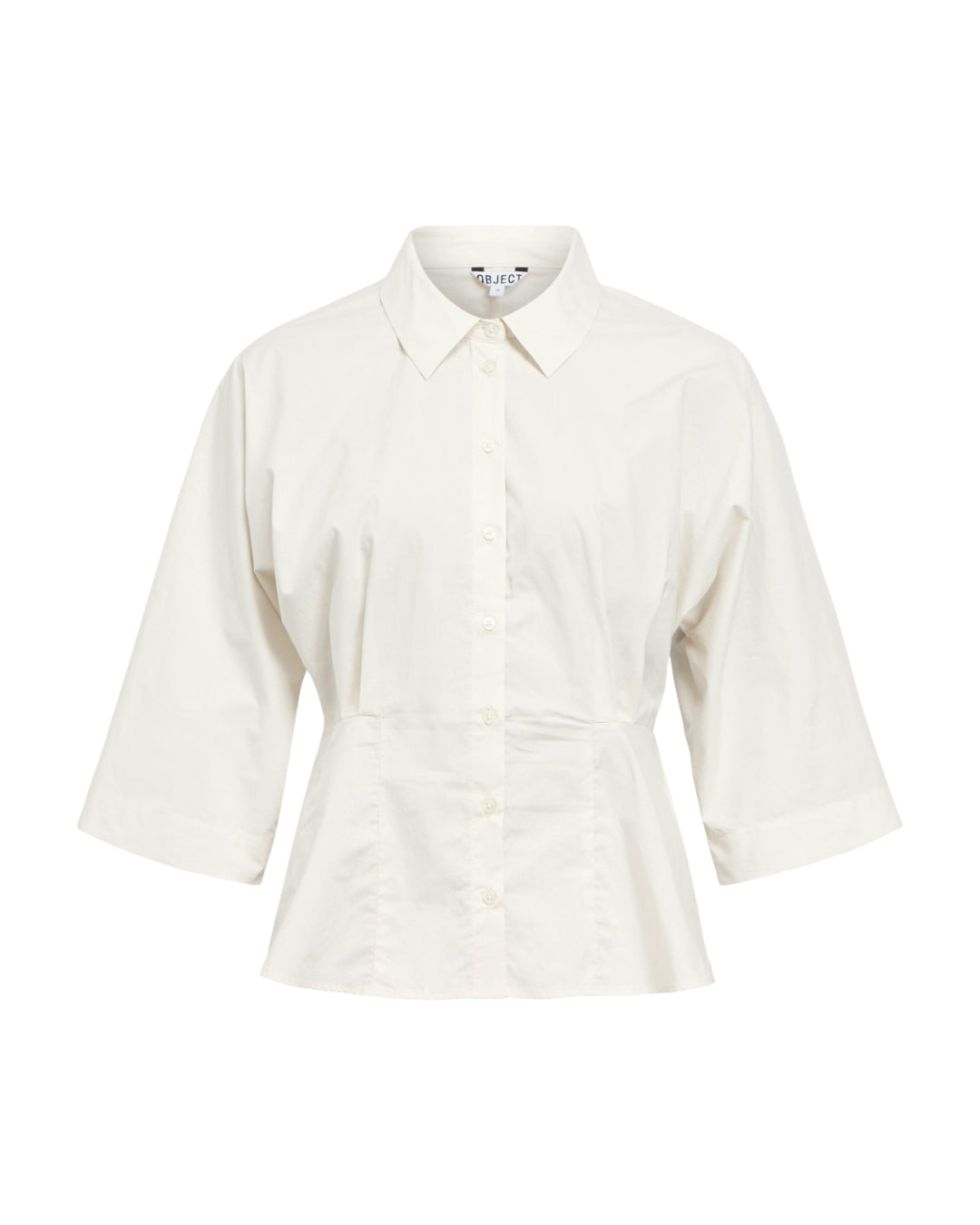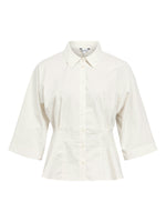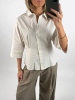 MERLE waisted skjorte, creme er den smukkeste kortærmede skjorte, i et tyndt creme farvet stof. Skjorten går ind i taljen og har brede t-shirt ærmer.
