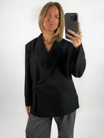 MIRABEL oversized blazer, sort er den perfekte oversized blazer, gjort endnu mere unik med dens flotte skæve snit. I og med blazeren er så oversized, giver den nærmest modsatte effekt af det maskuline fra en blazer, til at den bliver feminin, grundet fittet.