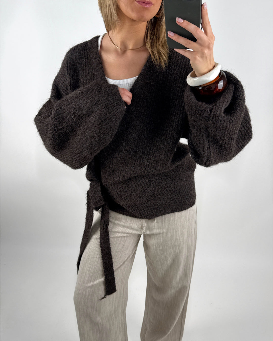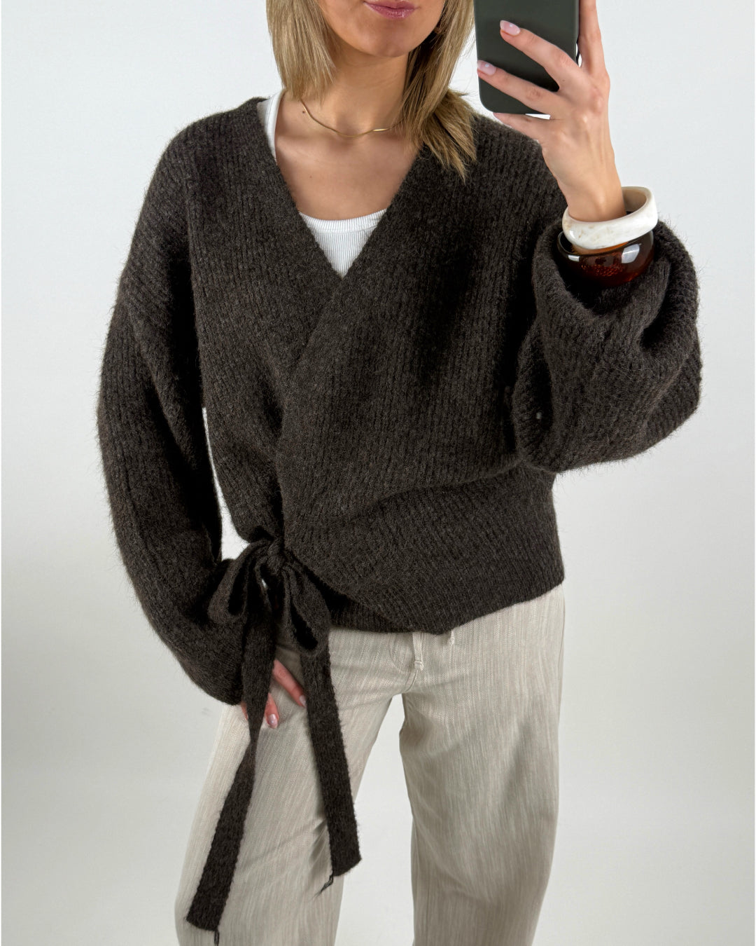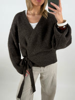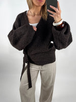 Denne chokoladebrune OLINE slå om cardigan kombinerer elegance og komfort med et moderne twist. Cardiganen har V-udskæring og et slå-om design, der bindes i siden med et matchende bånd, så du nemt kan tilpasse pasformen efter behov.