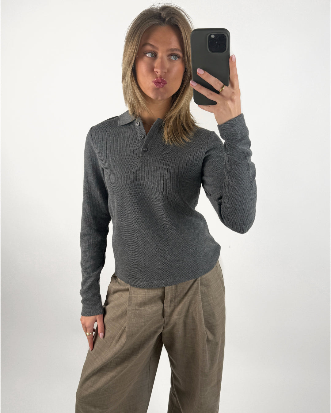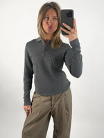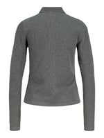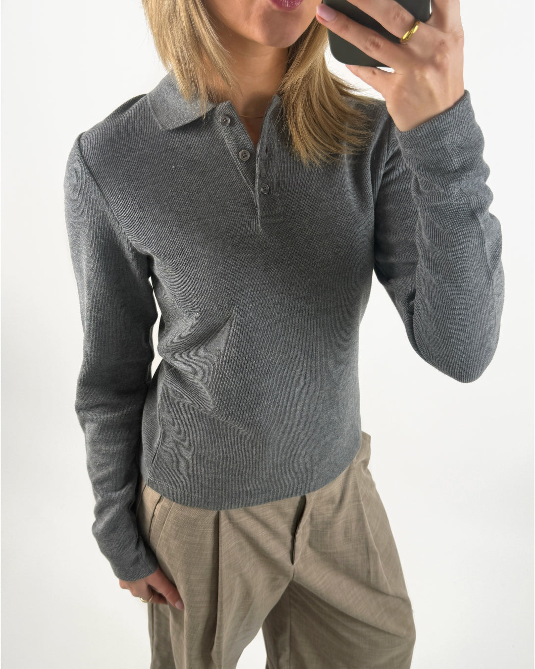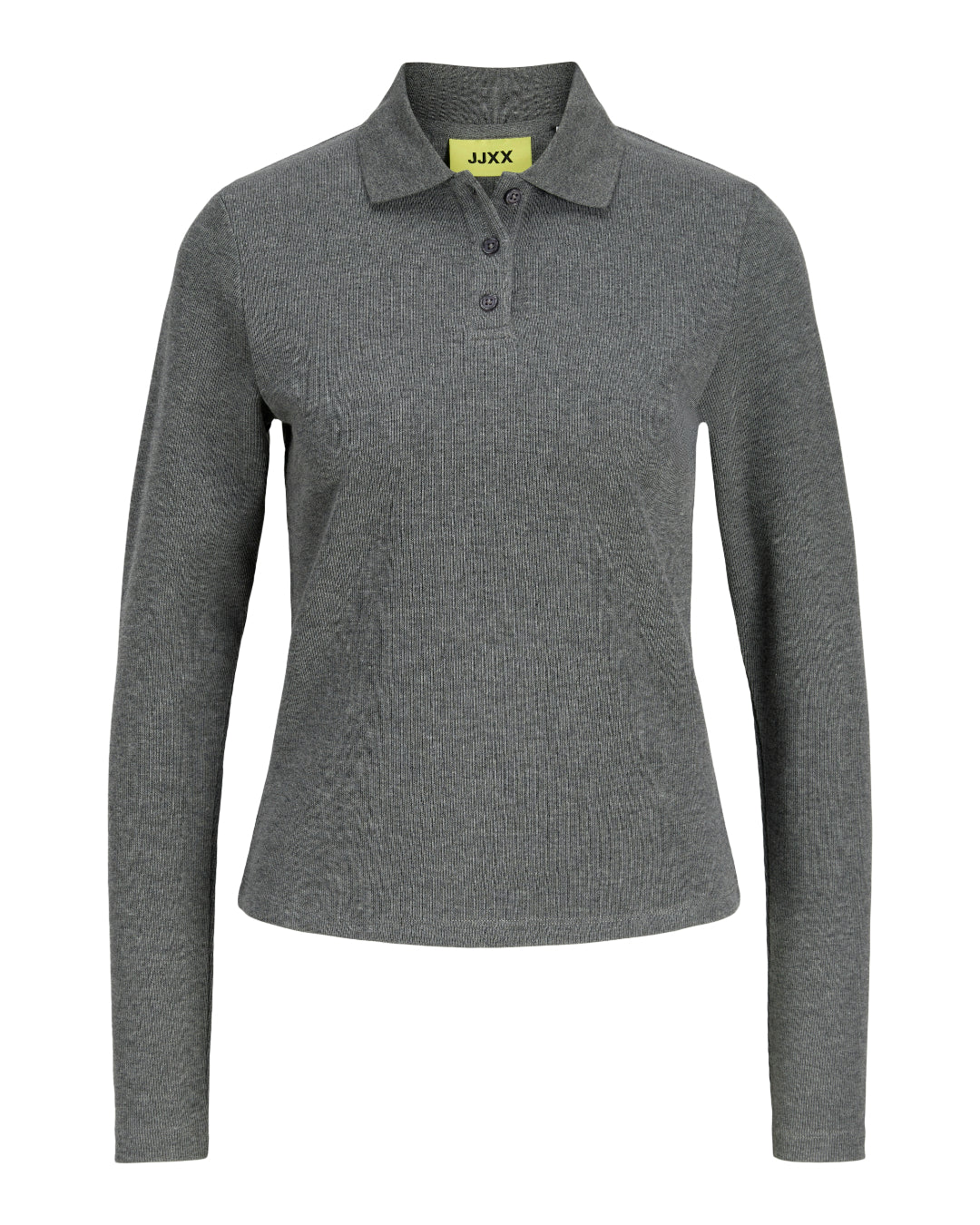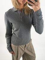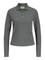 Giv din basisgarderobe et løft med denne dejlige langærmede OLIVIA polo bluse, grå i rib materiale. Blusen har den klassiske polo krave og 3 knapper til lukning på brystet. Stoffet er meget strækbart.