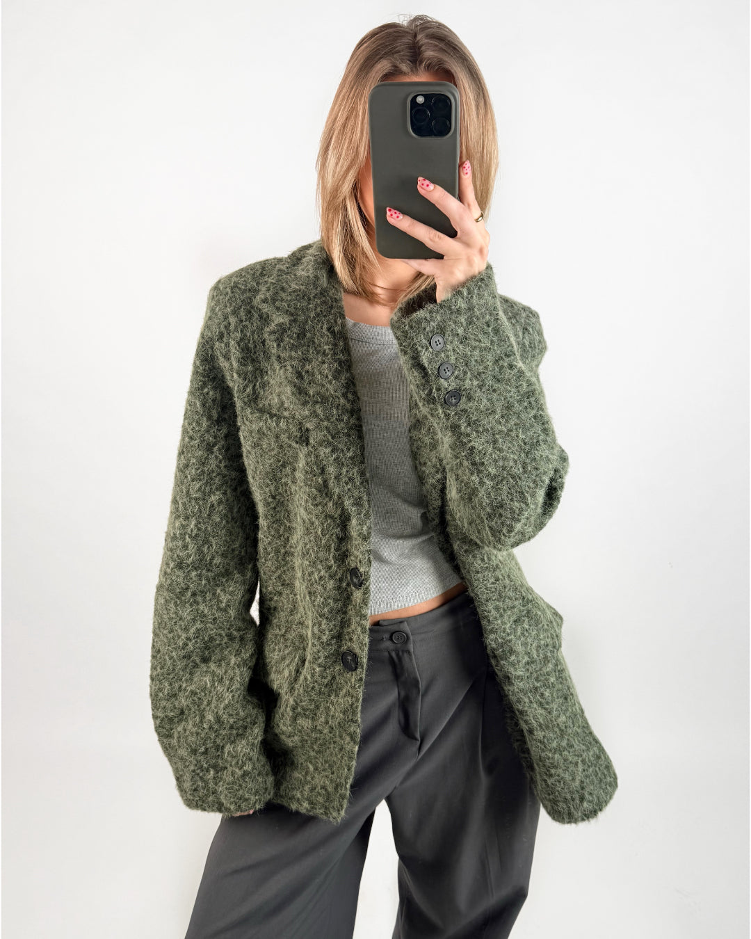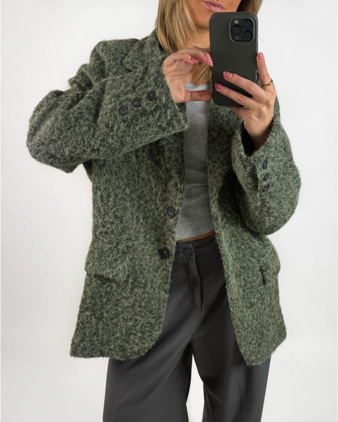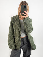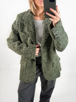 Vores smukke RUTH blazer jakke, grøn er i et kraftigt materiale som gør at det er den perfekte overgangsjakke. Jakken har form som blazer, men er i et tyk uldent materiale for at holde på varmen.
