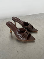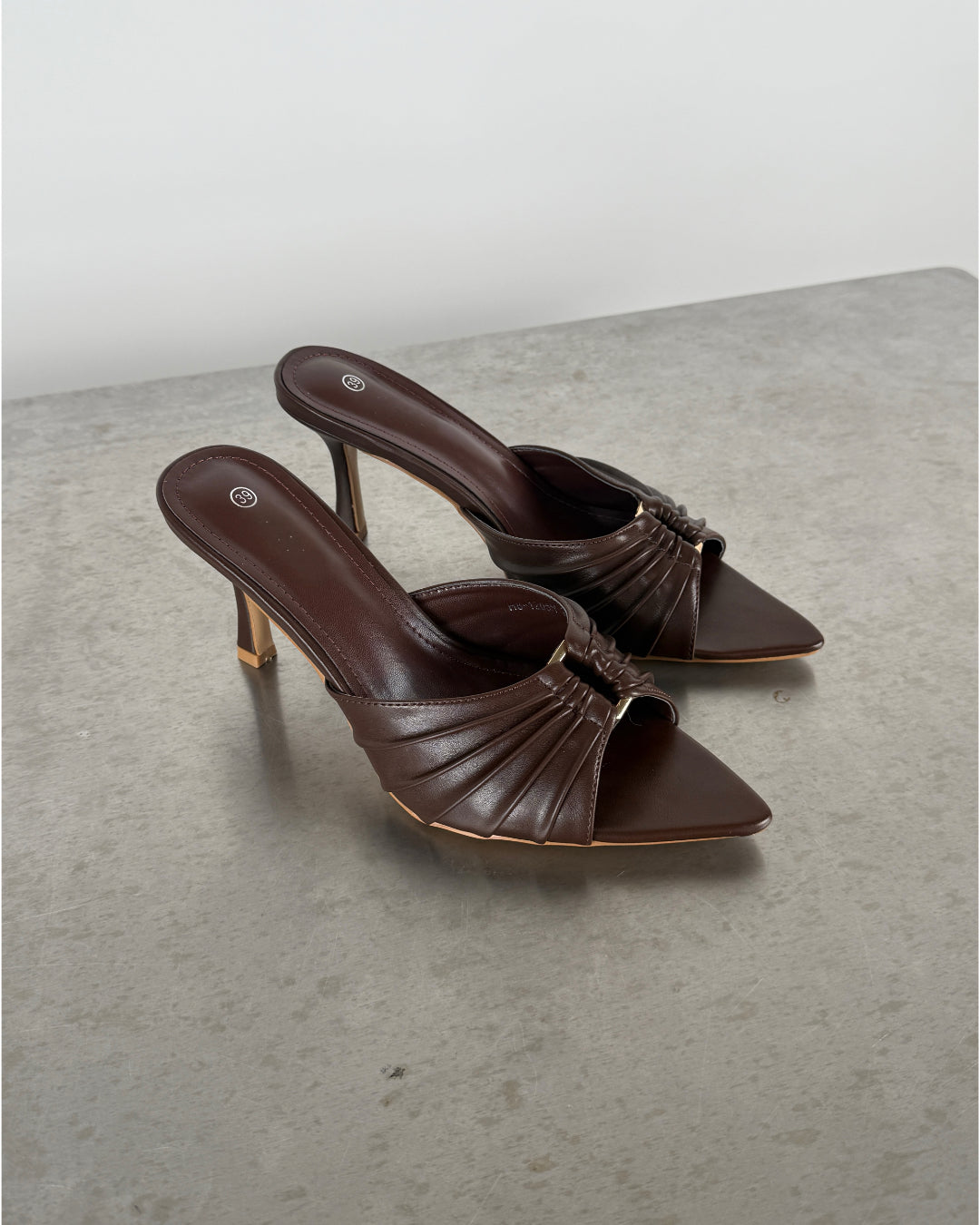 SELMA hæl, brun har mange fine detaljer som giver den det smukke look. Den er udsmykket med en lille guldfarvet ring oven på skoen, som er en del af den fine rynke effekt. Skoen er spids og er åben ved spidsen, som både giver et unikt og feminint look.
