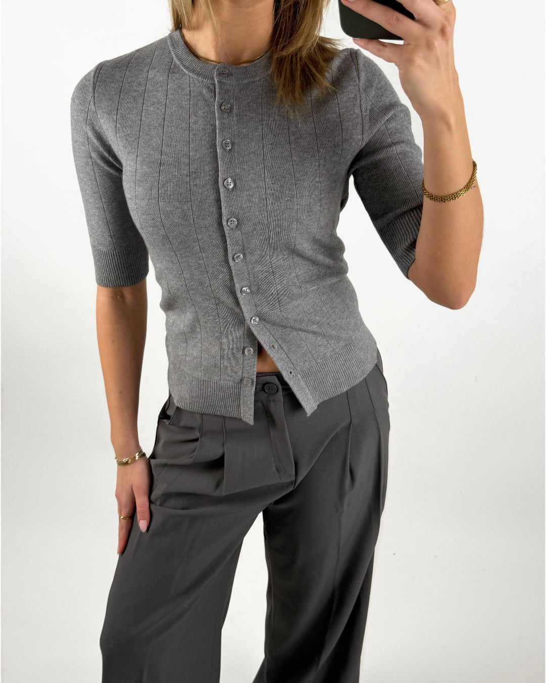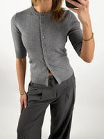 Den klassiske SPINA kortærmet cardigan, grå er med knaplukning hele vejen ned langs forsiden. Cardiganen har et enkelt og tidløst design med rund hals og fine ribkanter, som giver et elegant og let udtryk.